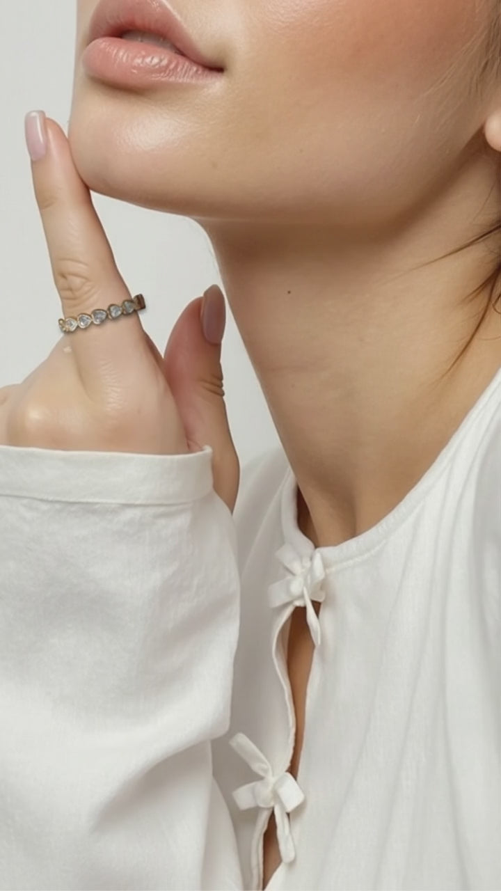 The Cactus Heart Ring showcases the ice-like brilliance of heart-shaped diamonds, meticulously secured in full bezels. This design highlights the collection’s masterful craftsmanship, pairing radiant, bright stones with smooth hand-finished metal. It’s a sophisticated blend of romantic clarity and sculptural gold, embodying the desert’s resilient, high-fashion elegance.